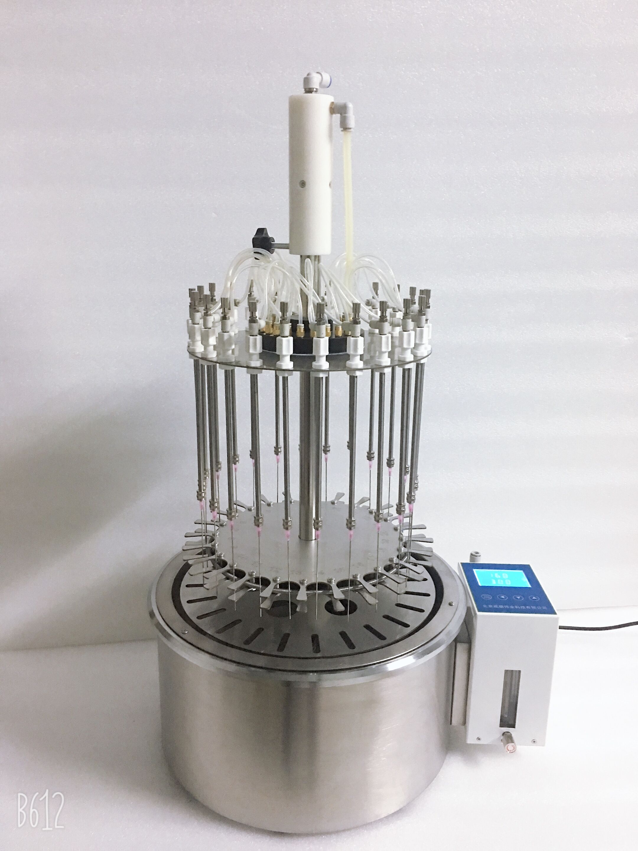 本儀器包括底座和支架裝置、樣品架和氣體分配系統(tǒng)。試管通過帶彈簧的試管夾和支撐盤來固定位置。每個樣品位都有數(shù)字編號;氣體通過流量計到達氣體分配系統(tǒng),靈活的引導(dǎo)管將氣體導(dǎo)入每個位置的閥和不銹鋼針,將氣體吹至樣品表面,從而使溶劑快速揮發(fā)。根據(jù)試管大小和溶劑多少,各導(dǎo)氣管可獨立升降至合適的高度。